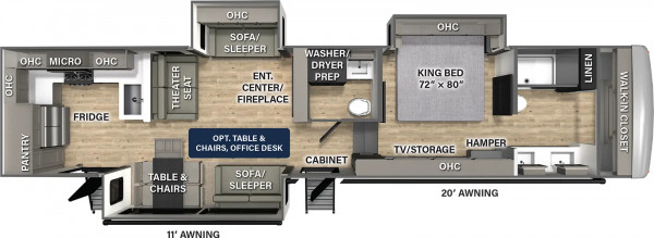 These fifth-wheels have a full kitchen and dining area, saving you money on food in the future. Cook your favorite family meals in the fully equipped kitchen. With a working fridge and freezer, you can store everything from meat, fresh produce, and dairy. The kitchen contains a pullout pantry and plenty of cabinet space for all your dishes and cookware. Along with a full kitchen, Palomino fifth-wheels come with a bathroom with a working shower, toilet, and storage space for all your toiletries.