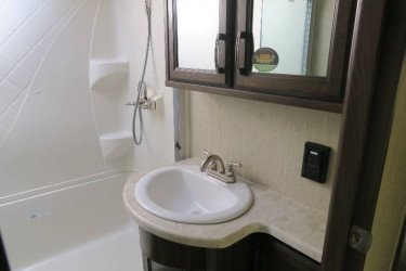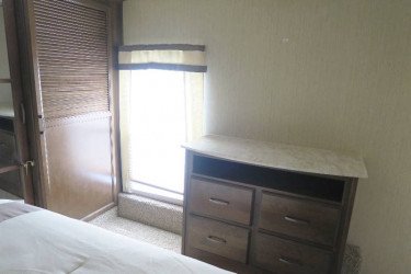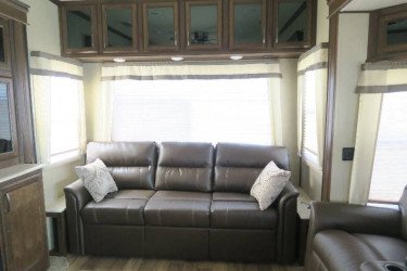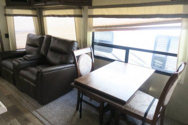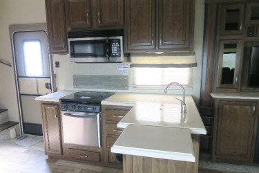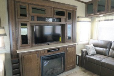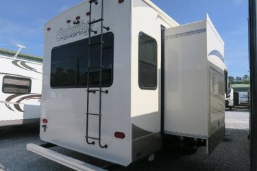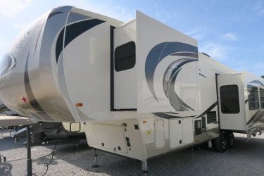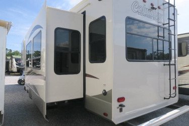 The RV for sale is a New 3917 Palomino Columbus Fifth Wheel by Palomino RV that is equipped with a tough fiberglass construction type, is room enough for 6 RV-ers to sleep, and has 3 spacious slides.