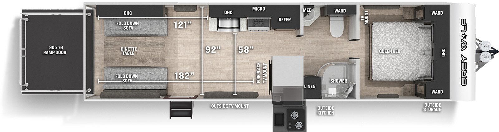 This Cherokee Grey Wolf Toy Hauler is 33ft 6in long, is in great condition weighs 5355 (dry), has a "26mbrr" floorplan, and is available to you at your family RV dealer Ponchatoula in Ponchatoula, LA.