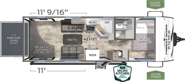 Keystone Toy Haulers are renowned for featuring the practicality of an enclosed trailer while having the high-end design of a traditional recreational vehicle. Steel tie-downs keep your valuable traveling “companions” secure in all climates and elevations, while engineered wood keeps their rears protected from any crag or rock. Inside, entertainment centers, spacious cooking areas, and modern bathrooms form the perfect atmosphere for any afterparty!