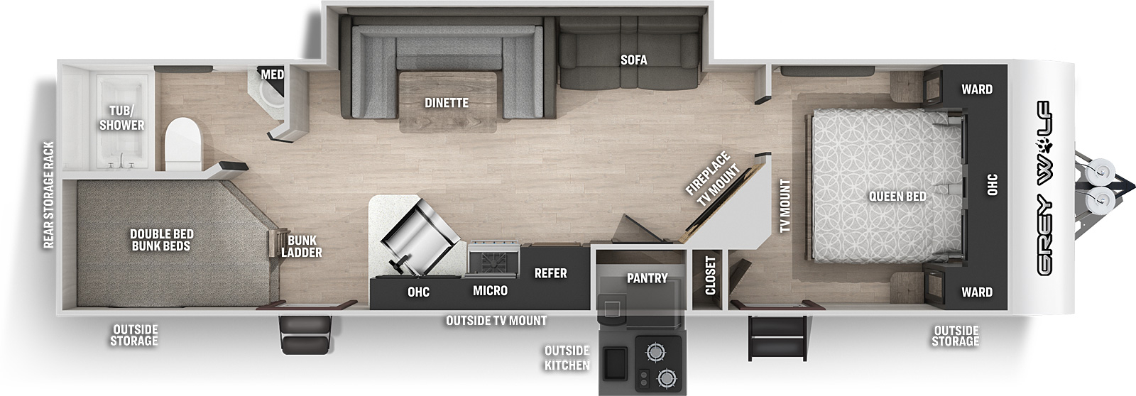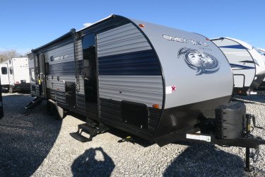 This Cherokee Grey Wolf Travel Trailer weighs 5825 (dry), is in great condition has a "27dbh" floorplan, is 33ft 8in long, and is available to you at your family RV dealer Ponchatoula in Ponchatoula, LA.
