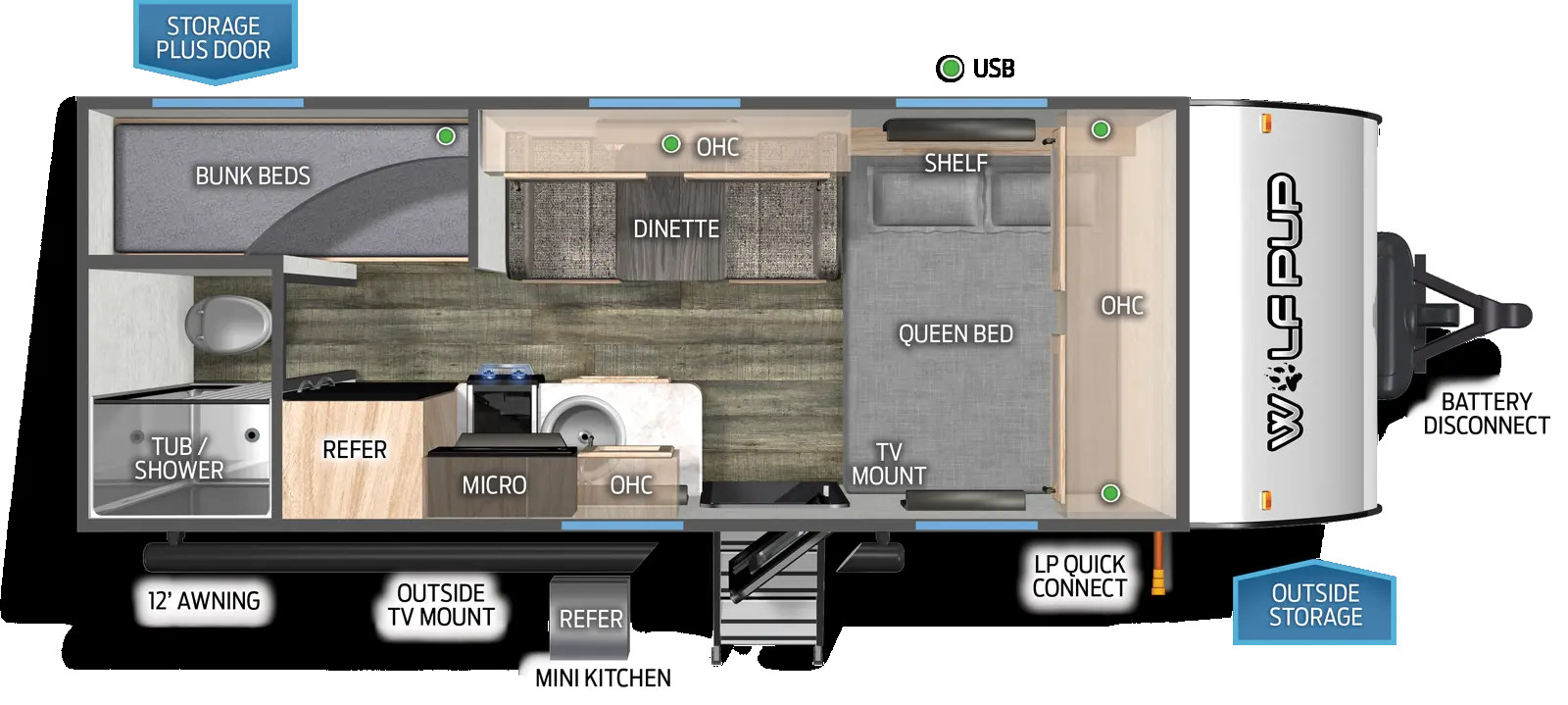 This Cherokee Wolf Pup Travel Trailer has a "16bhsblw" floorplan, is 21ft 9in long, weighs 3810 (dry), is in great condition and is available to you at your family RV dealer Ponchatoula in Ponchatoula, LA.