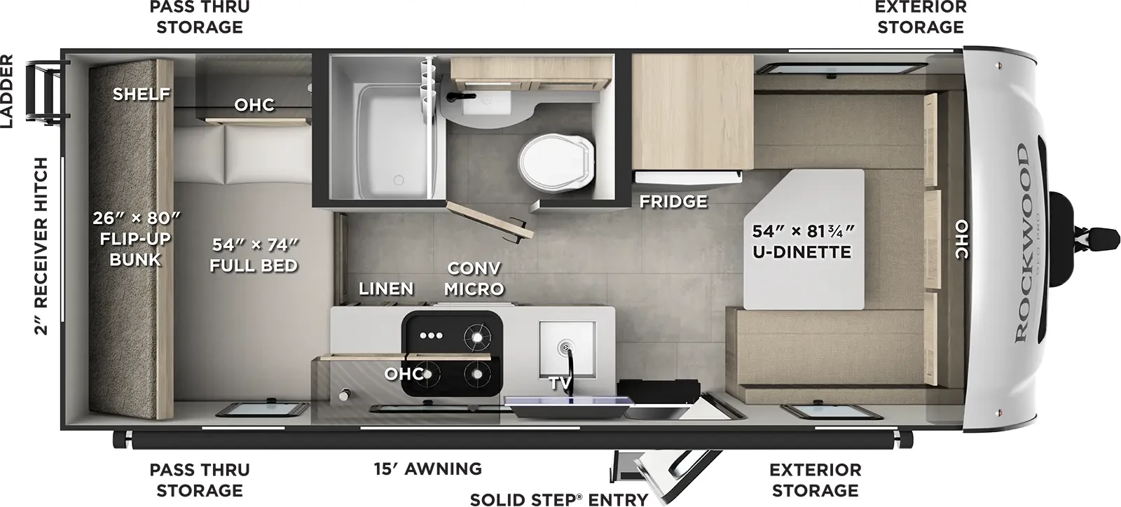 This Rockwood Geo Pro Travel Trailer has a "19dbh" floorplan, is 20ft 8in long, is in great condition weighs 3458 (dry), and is available to you at your family RV dealer Holden in Holden, LA.