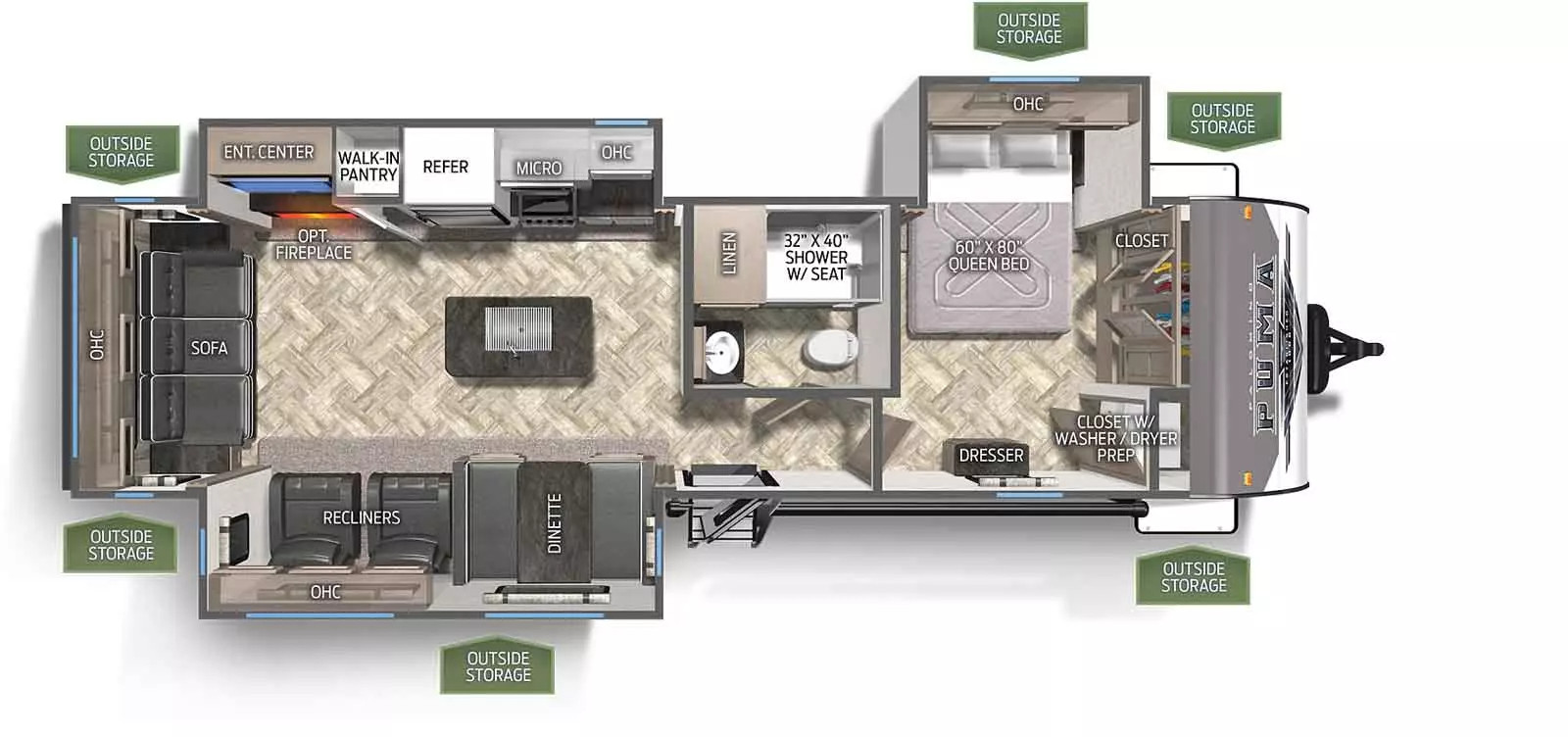 This Puma 31rlqs Travel Trailer has a "31rlqs" floorplan, is in great condition is 36ft 1in long, weighs 8770 (dry), and is available to you at your family RV dealer Ponchatoula in Ponchatoula, LA.