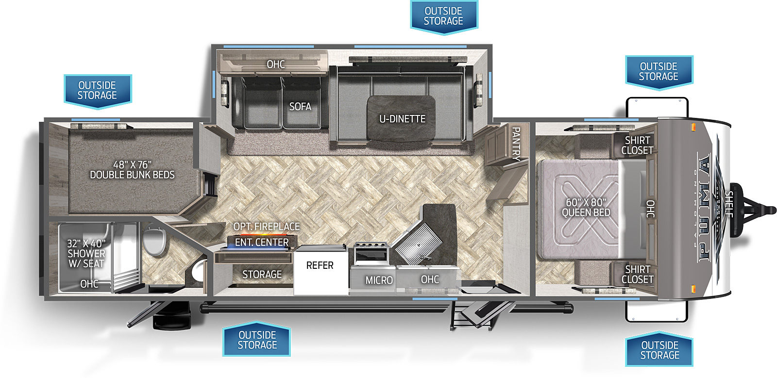 This Puma 28dbfq Travel Trailer is 32ft 10in long, is in great condition weighs 6830 (dry), has a "28dbfq" floorplan, and is available to you at your family RV dealer Ponchatoula in Ponchatoula, LA.